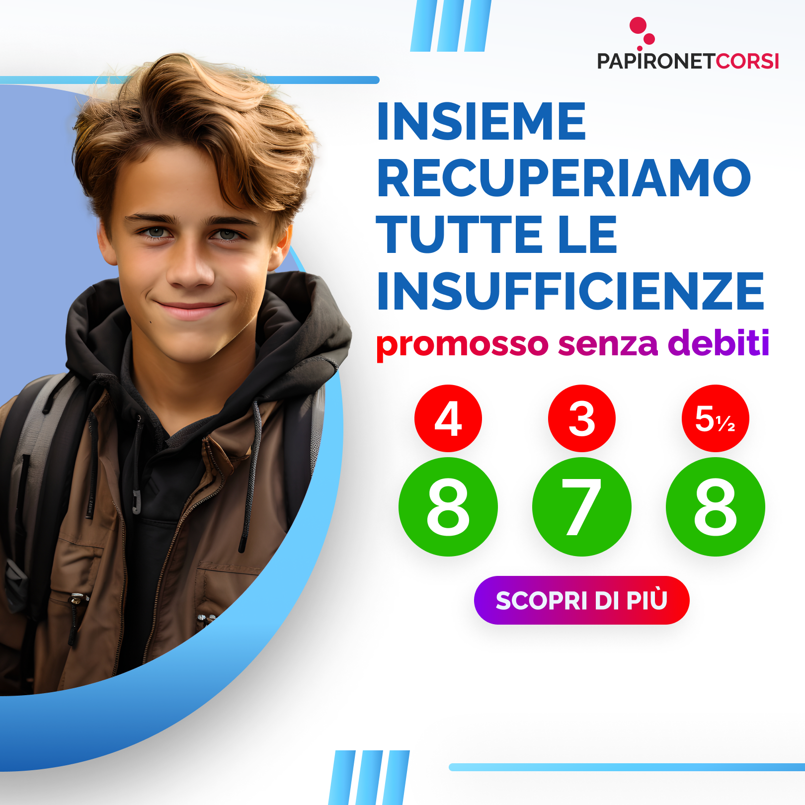 Hai delle insufficienze? Non temere! Il programma di recupero insufficienze è qui per aiutarti a superare le difficoltà e a raggiungere la promozione senza perdere l’anno scolastico. Puoi trasformare le tue insufficienze in successi e garantire di non perdere l’anno scolastico. Non lasciare che le insufficienze ti rallentino.